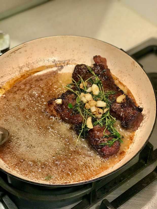 Place the herbs and garlic on top of the steak, and push the steak toward the top of the pan. Tilt the pan toward you to pool the butter near the bottom. Using a spoon, continuously scoop the butter over the top of the steak for about 30–45 seconds.